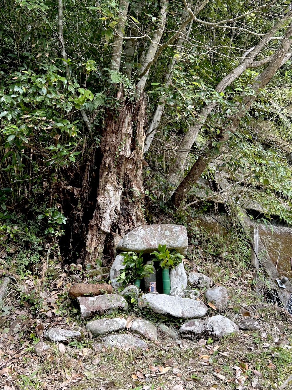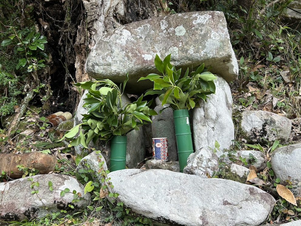 現在カシの木は伐採され、根元が残るのみ。地元の旧家で祀っているもので、何代か前の先祖が建てたものと伝わっているとのこと。新しい榊とお水がお供えされているが、今は他からお参りに来る人はいないそうだ(2024年10月取材)。