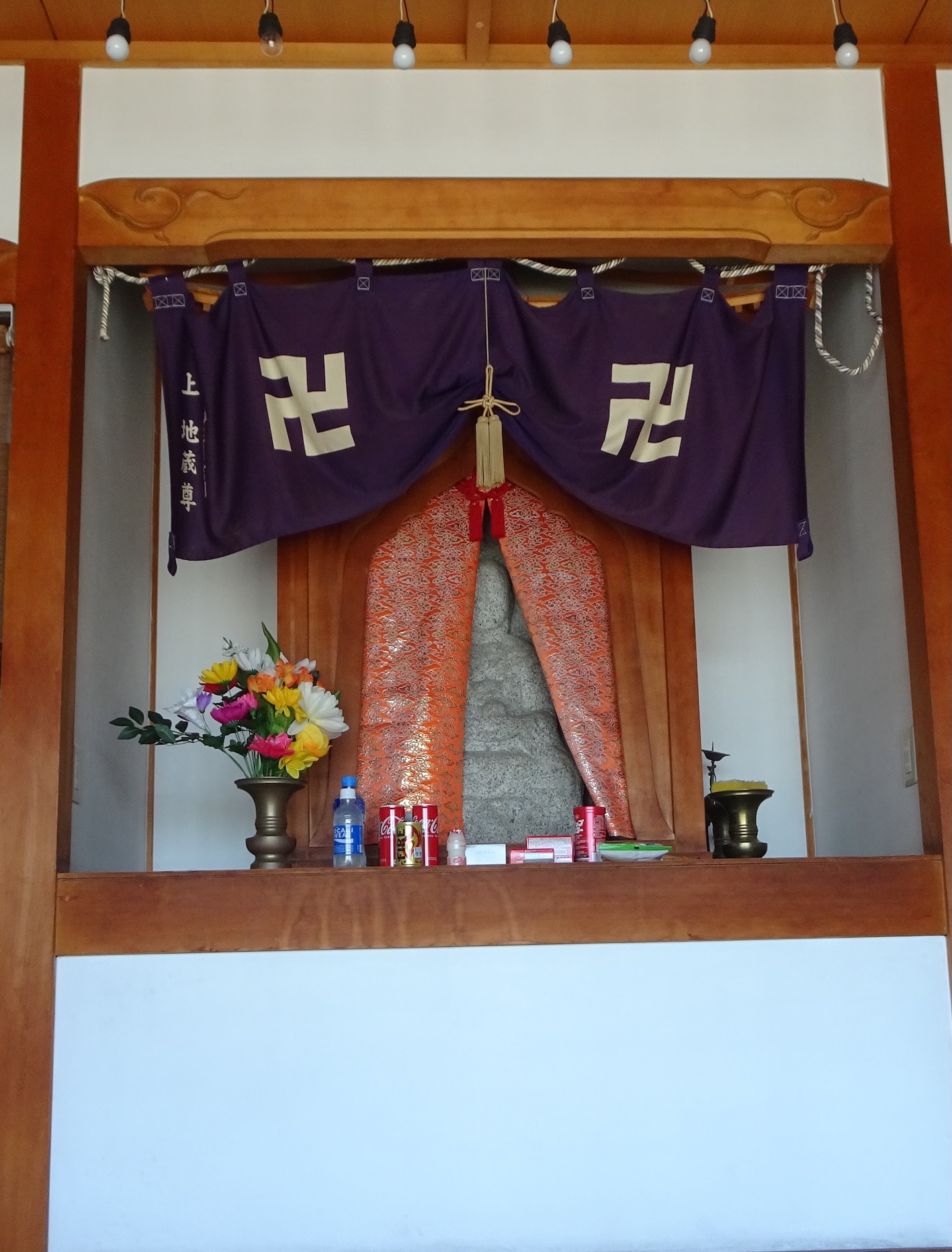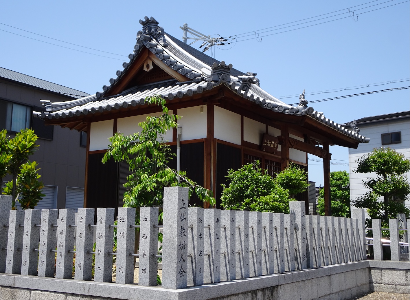 住宅街に立つ立派なお堂で、中に祀られているのは、石の小さいお地蔵さまである。上(かみ)地蔵尊もしくは上村(かむら)地蔵尊と呼ばれる。家内安全、無病息災、とくに安産と母乳の出をお願いすると霊験あらたかと言い伝えられていると、現地に表示されている「上村地蔵尊縁起由来」に記載されている。