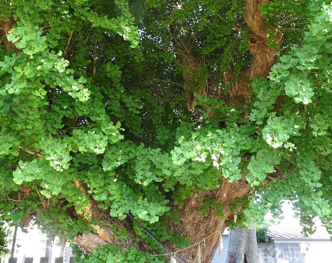 イチョウは市の保存樹木に指定されており、二股に分かれて大きく枝を広げている