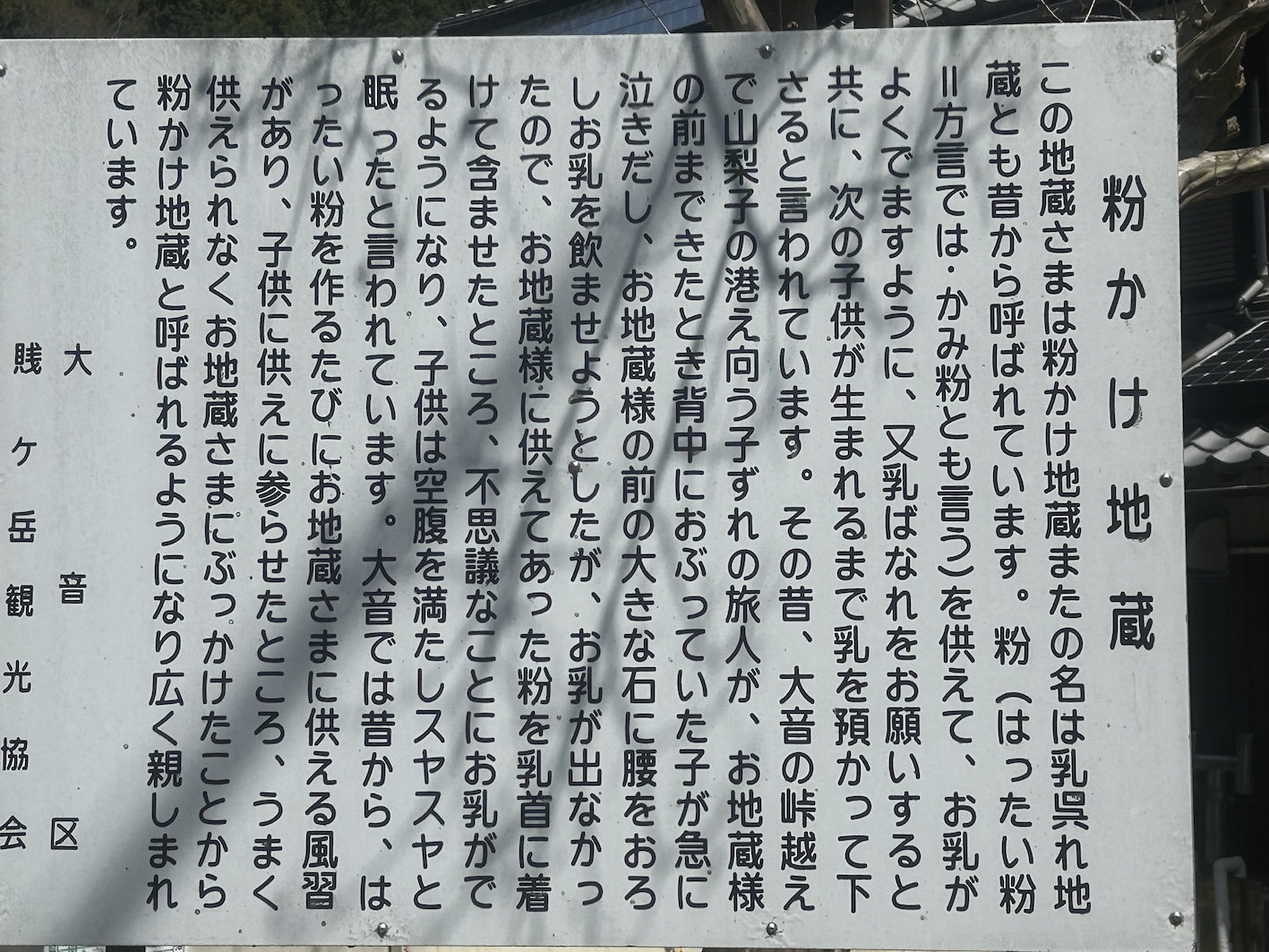その昔、大音の峠越えで山梨子の港へ向かう子連れの旅人がお地蔵さまの前まできたとき、背中におぶっていた子が急に泣き出したのでお地蔵さまの前の大きな石に腰をおろして乳を飲ませようとしたがお乳が出なかった。そこでお地蔵さまに供えてあった粉を乳首に付けて含ませたところ、不思議なことにお乳が出るようになった、という民話も案内板で紹介されている。