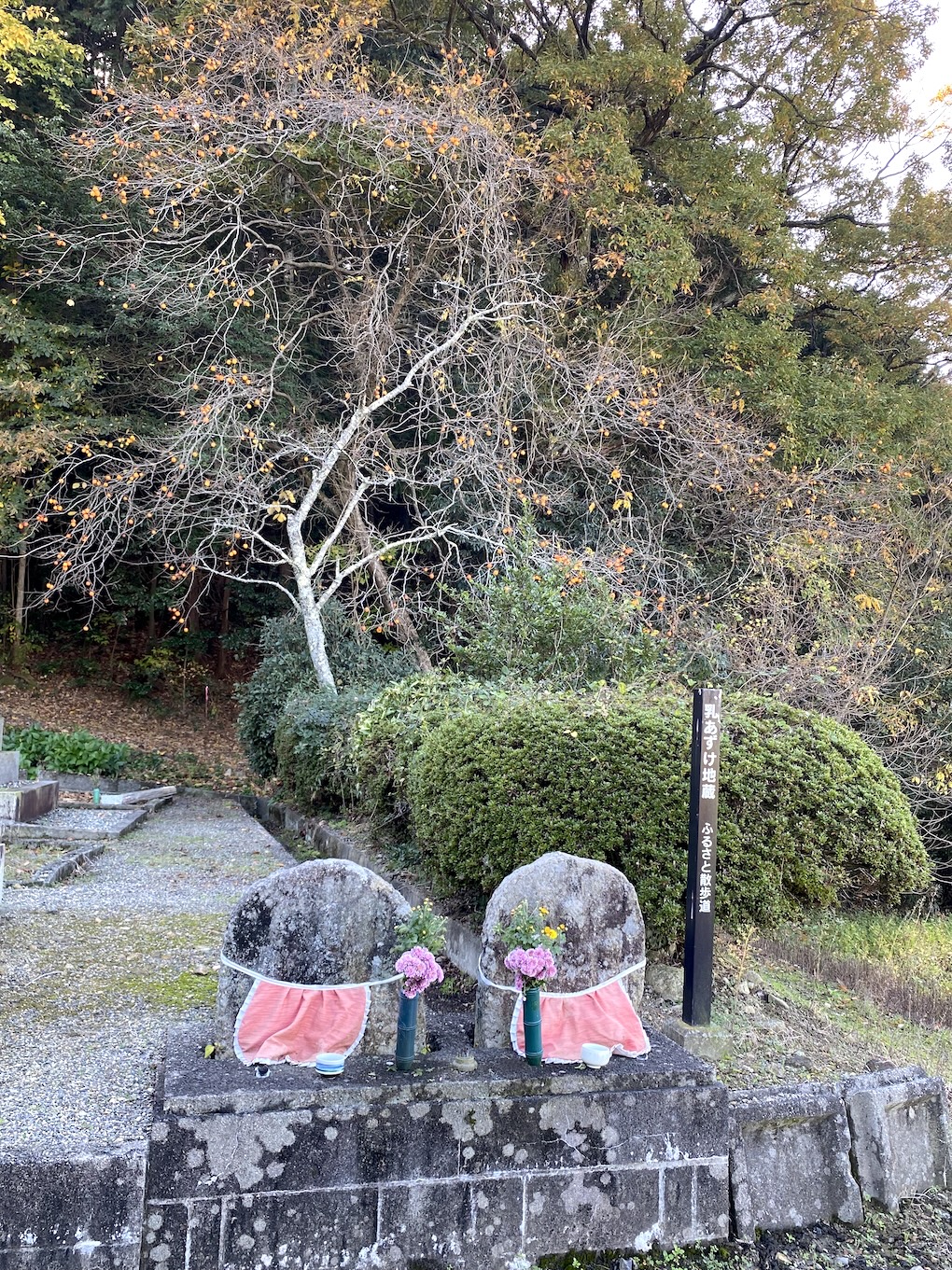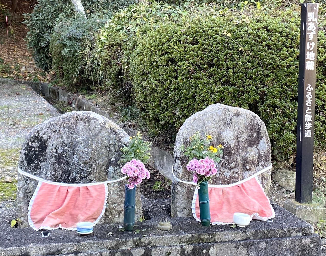 神郷集落の古い共同墓地の入り口に「二石六仏*」の六地蔵がある。203号線から畑地を通って共同墓地へ通じる狭い道路の入り口に「乳預け地蔵」という案内板が立っているので、そこから入っていく。出産後乳が張ったときは、このお地蔵さんに「一時おあずけする」と乳の腫れが治まるというご利益があると東近江市能登川博物館サイトにある。