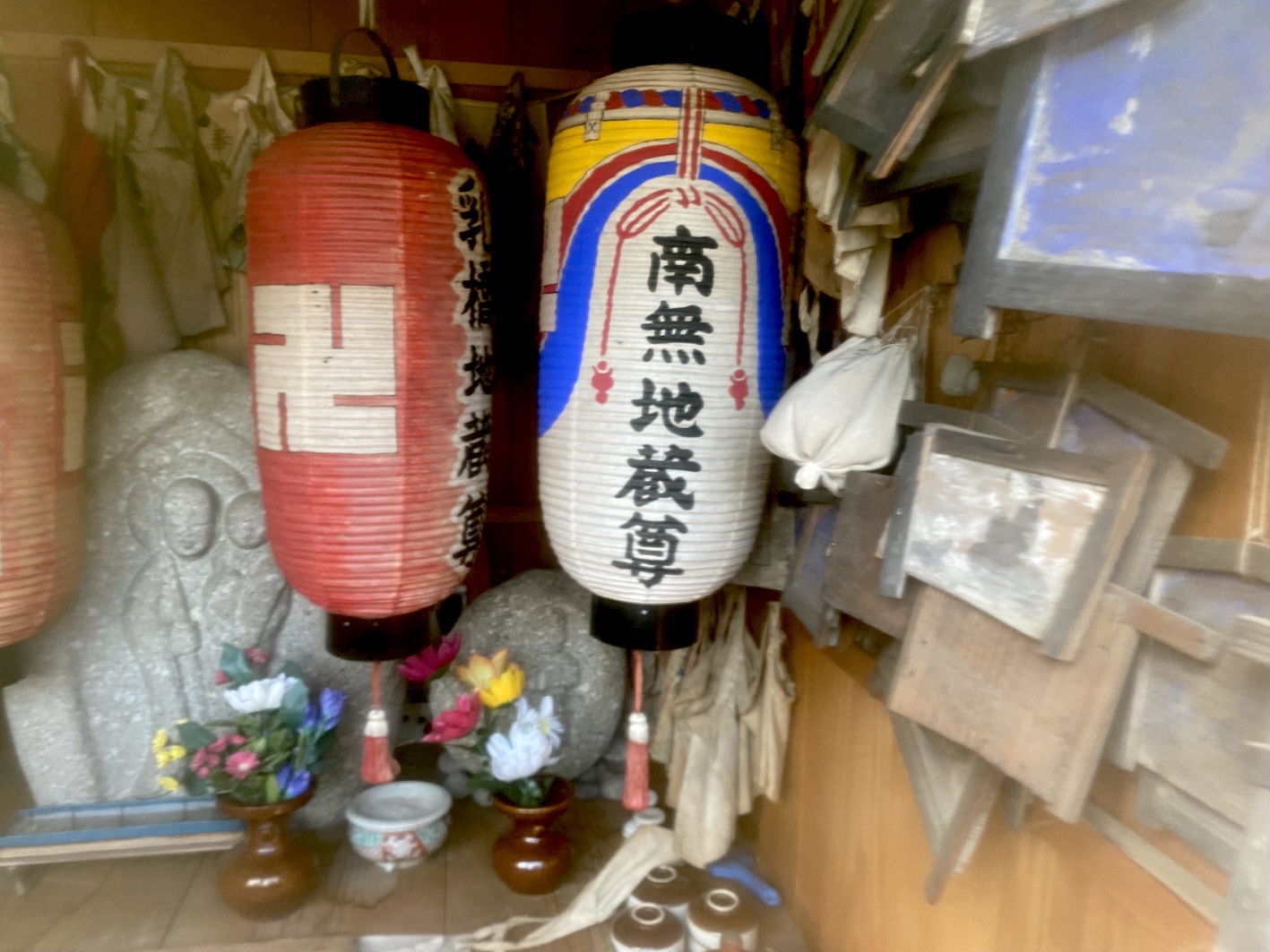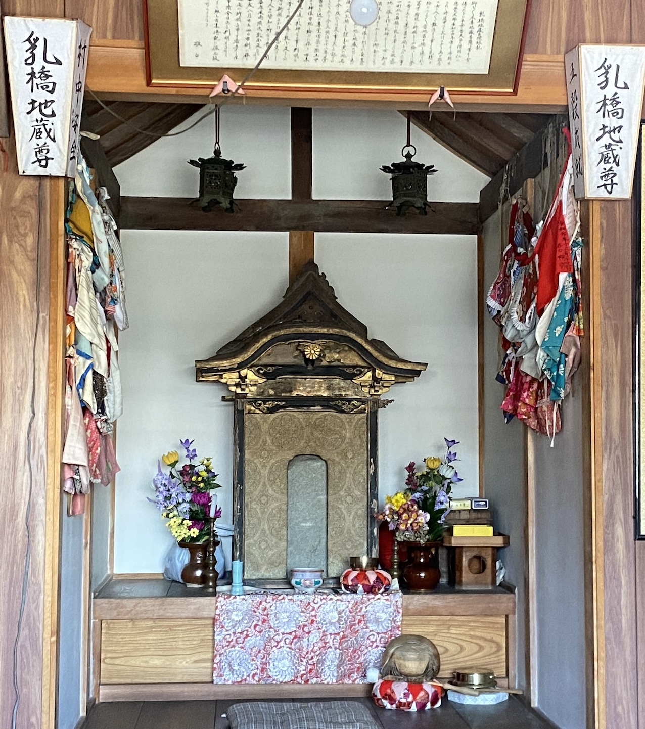 建部南町の堂内には赤ちゃんを抱いた石地蔵が祀られ、乳型、絵馬、多くの涎掛けが所狭しとかけられている。絵馬は女性の拝み絵馬と判読できるものはあるものの、多くは古く塗りが剥がれており、外からは乳絵馬なのかどうかはっきりわからない。