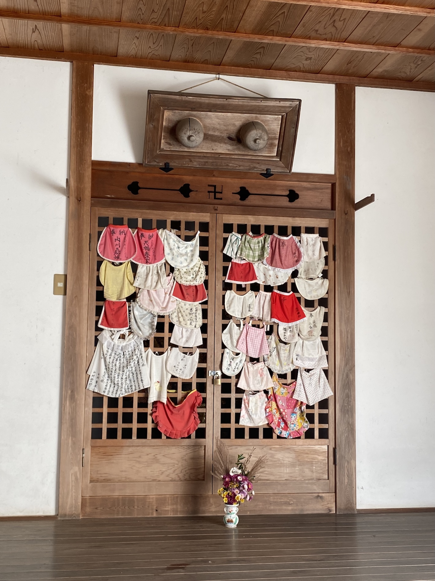 正面の格子には涎掛けがびっしりと結びつけられている