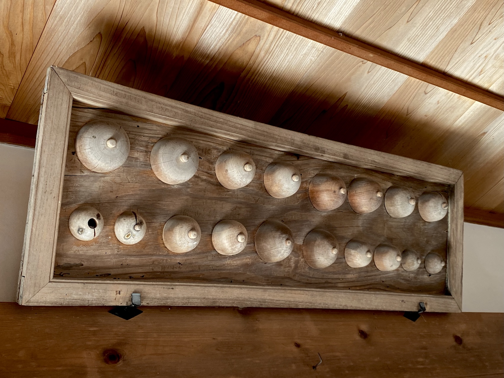 これは立体乳型絵馬としては珍しく大きな絵馬で、2面ある。片方は縦43cm、横89cm、木製のお椀を伏せたような大きな乳形が2個ついているもの、もう一面は縦41.5cm、横124.5cmの大きさで、大小さまざまな木製の乳形が18個付けられている。