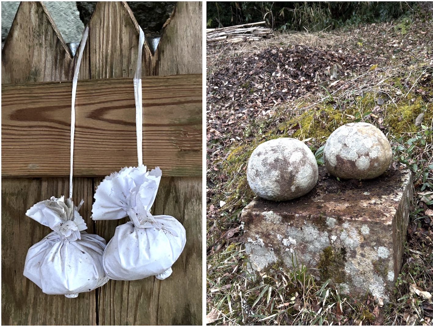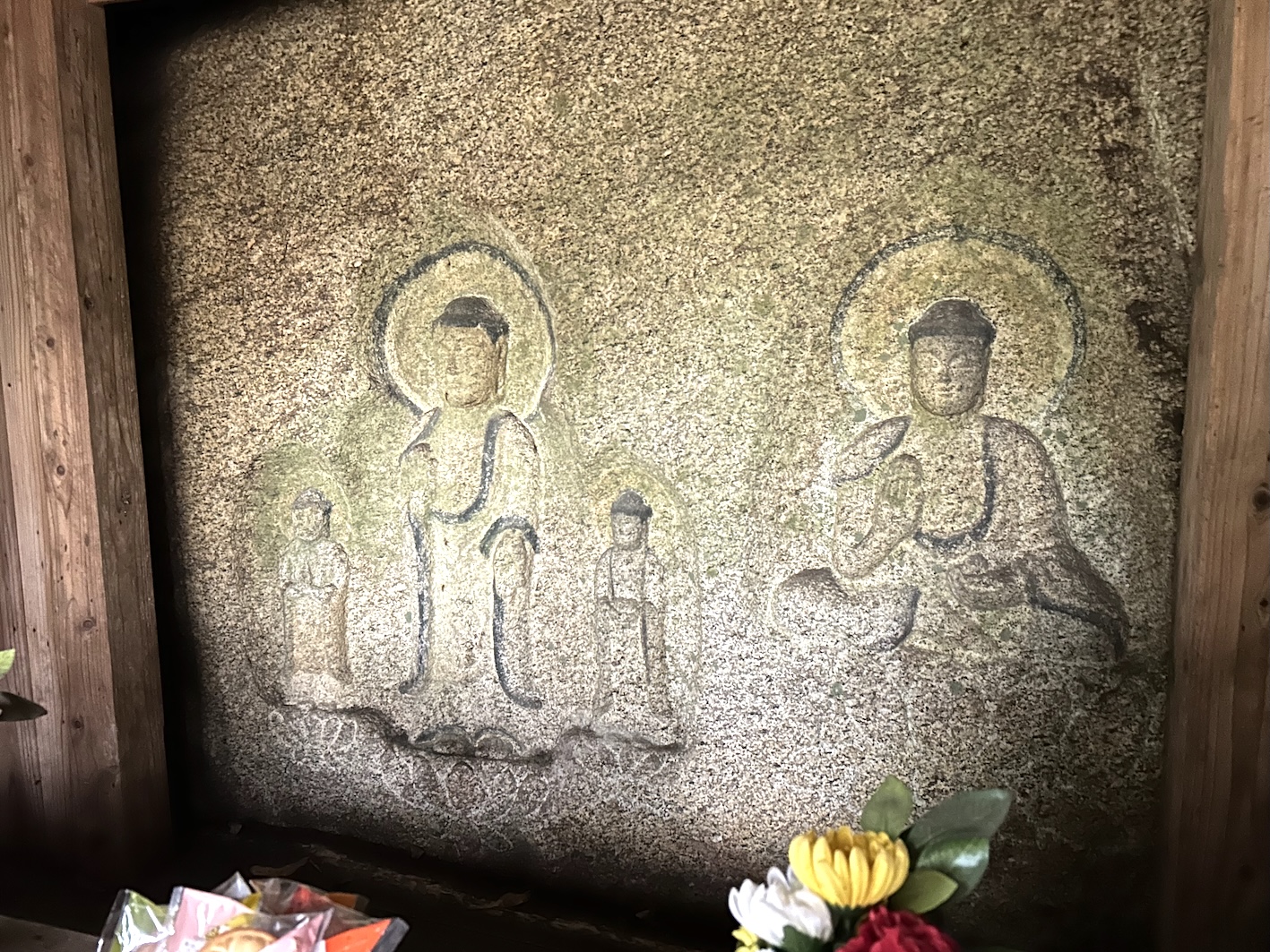 奥がそのまま崖になっていて、花崗岩に彫られた磨崖仏がある。お参りすると乳の出に効果があると言われ、お堂の前に乳型が奉納されている。現地の複数の案内板には乳の祈願の情報はない。境内には五輪塔がいくつかあるが、その最上段の石を2つ並べて台の上に置いたらしい、いかにもおっぱいですよというものが、参道の脇にある。似たようなものはよそで見ることはあるが、これほど意図がはっきりしているのは珍しい。