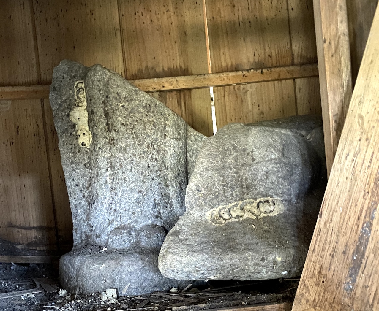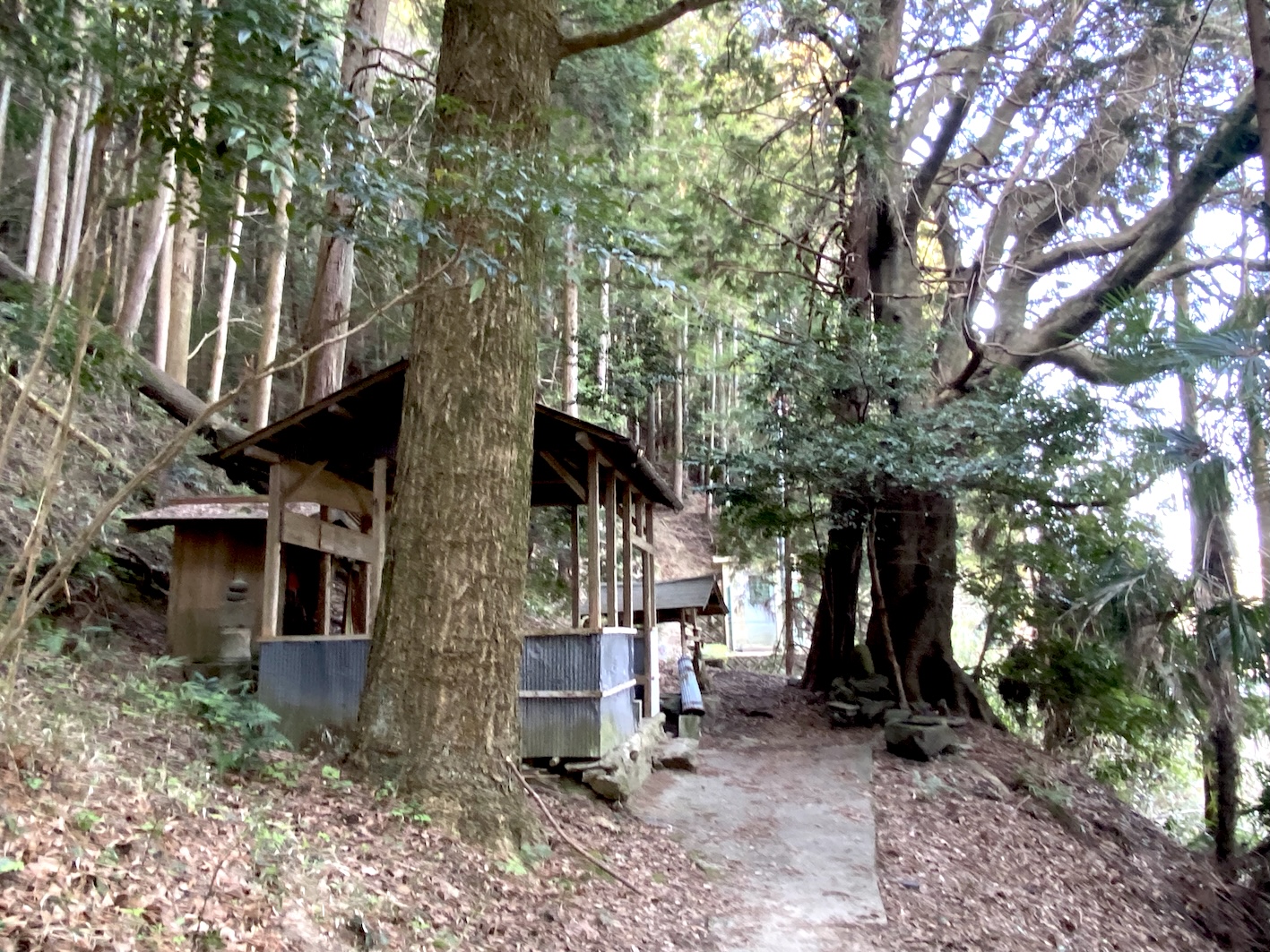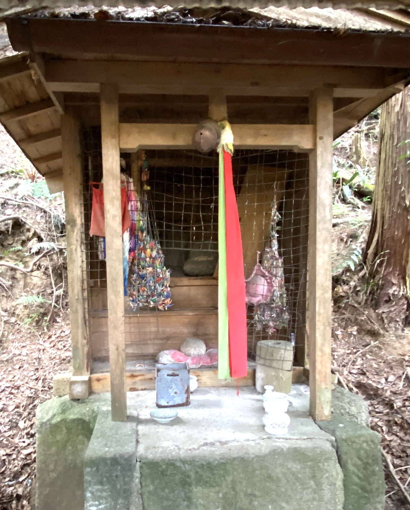 地蔵堂は簡単な作りで腰掛けて座れるようになっており、奥に石仏が祀られた小祠があり、千羽鶴が奉納されている。側に山神と彫られた石碑と、山から水を引いて貯めるようにした井戸のようなものがある。また対岸の土手には水神の石碑があり、信仰のある石造物が多い地域である。