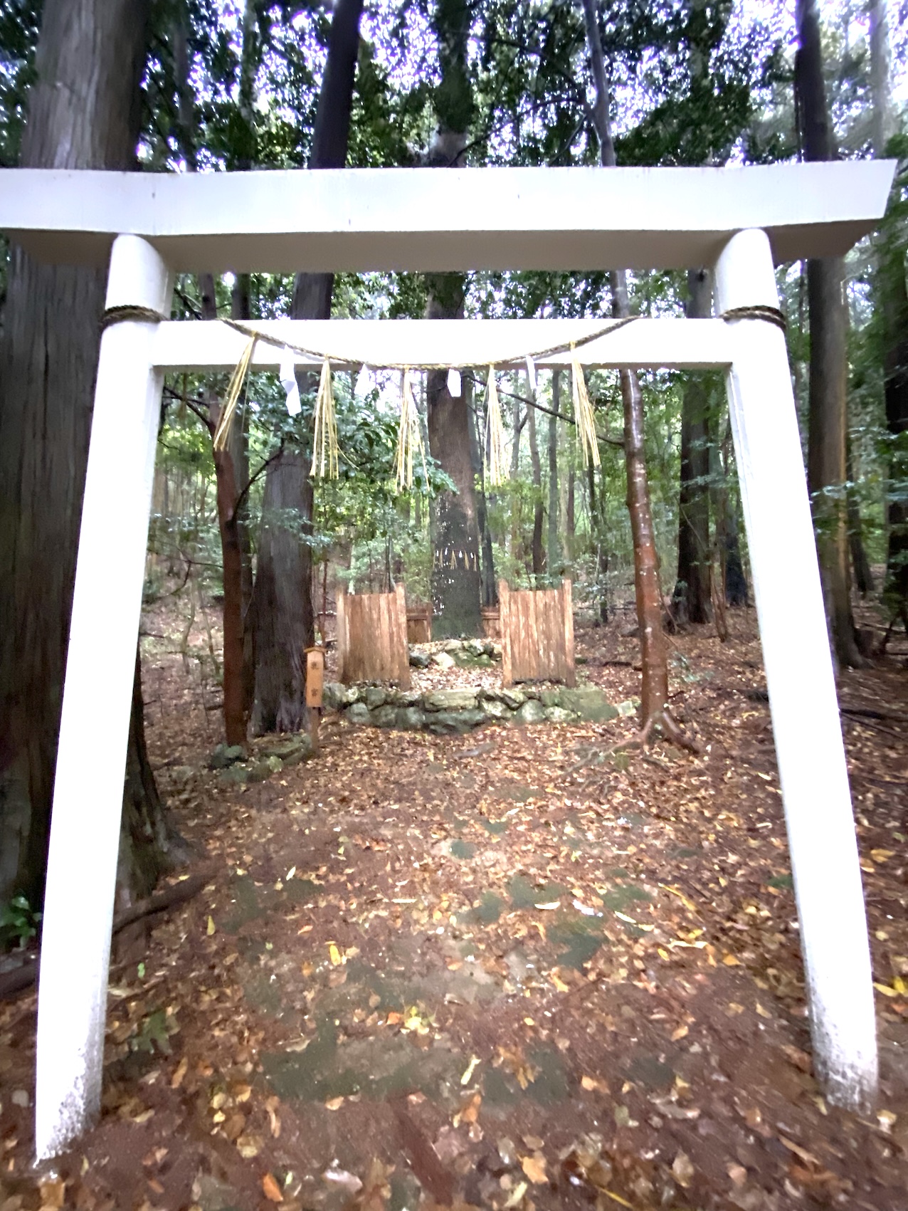 林の中を進むと白い鳥居があり、奥にクスノキがある