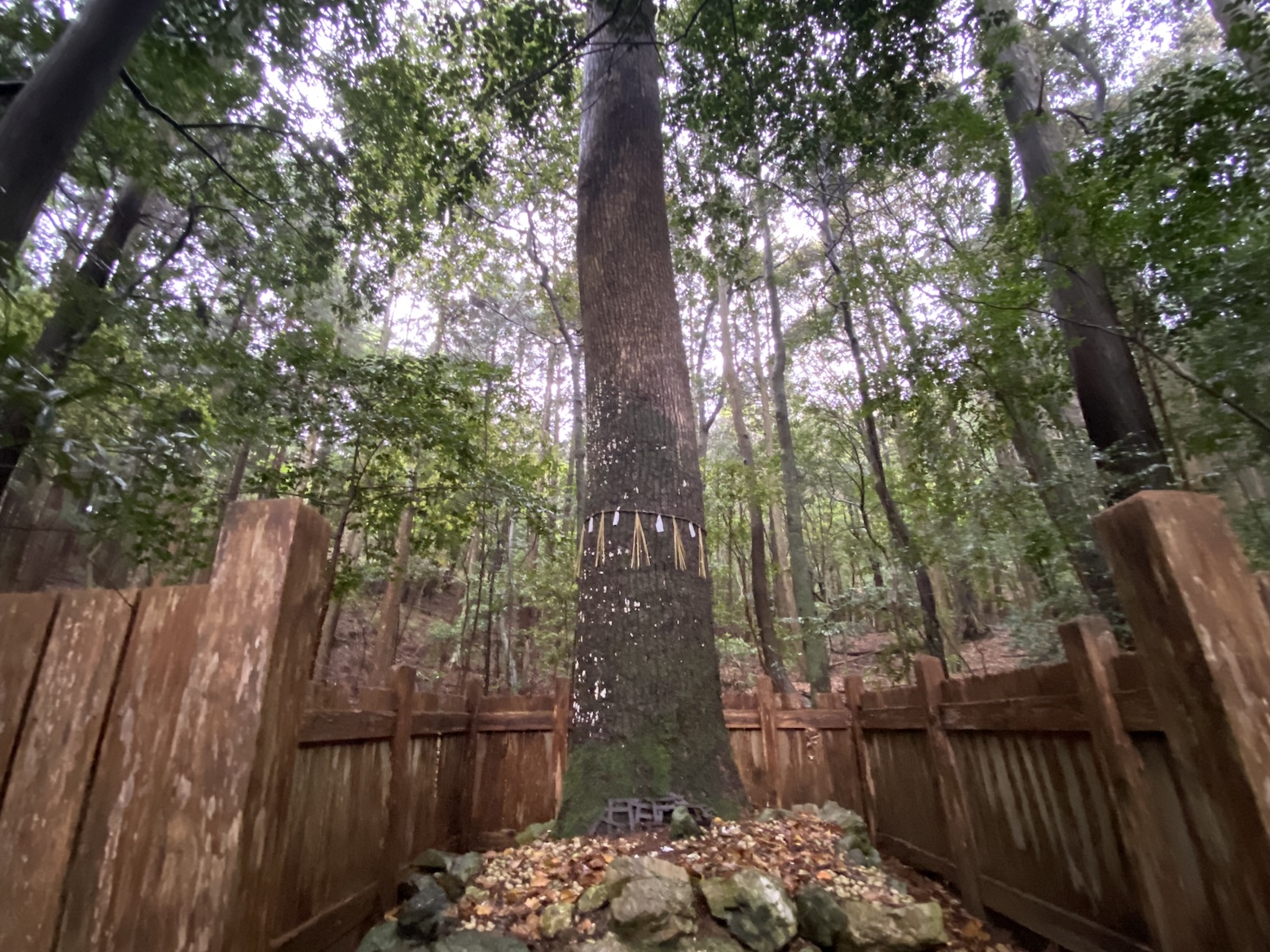 クスノキにはしめ縄が巻かれていて、木の柵で囲まれている