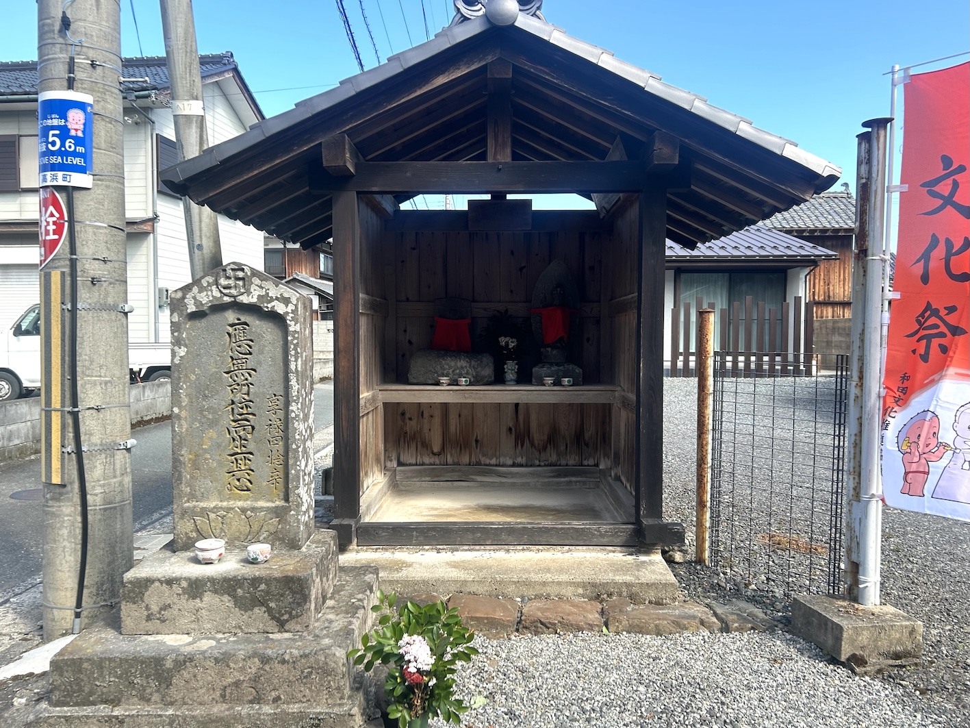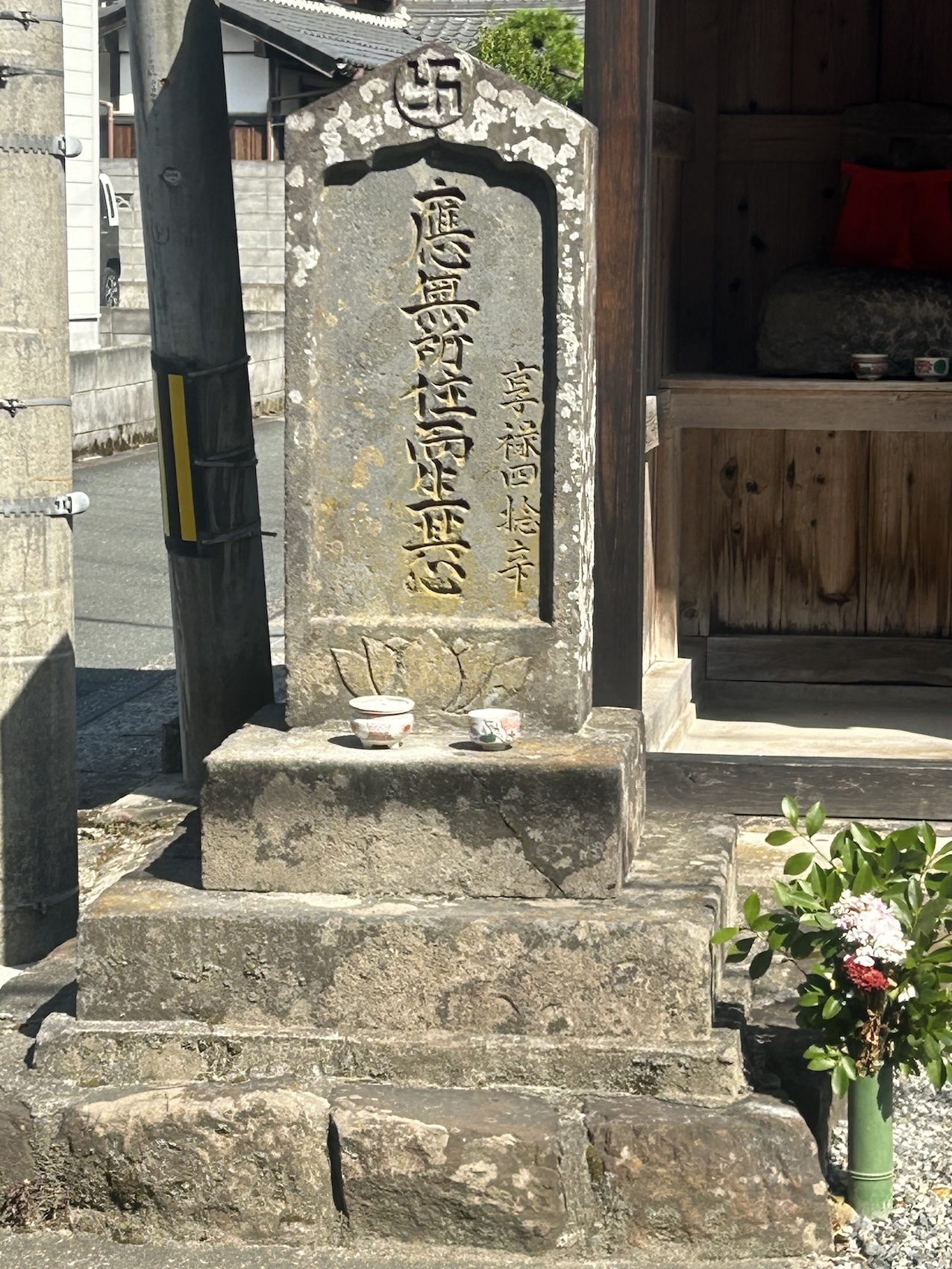 石碑の表には享禄4年(1531)の銘が彫られ、裏には「天保六(1836)乙来秋再建之」とある。この文言からそばの地蔵堂は江戸時代のものといわれ、石造りの千手観音と地蔵が祀られる。個人の敷地で、毎日お茶やお花を絶やさずお参りしているとのこと(2024年9月訪問)。