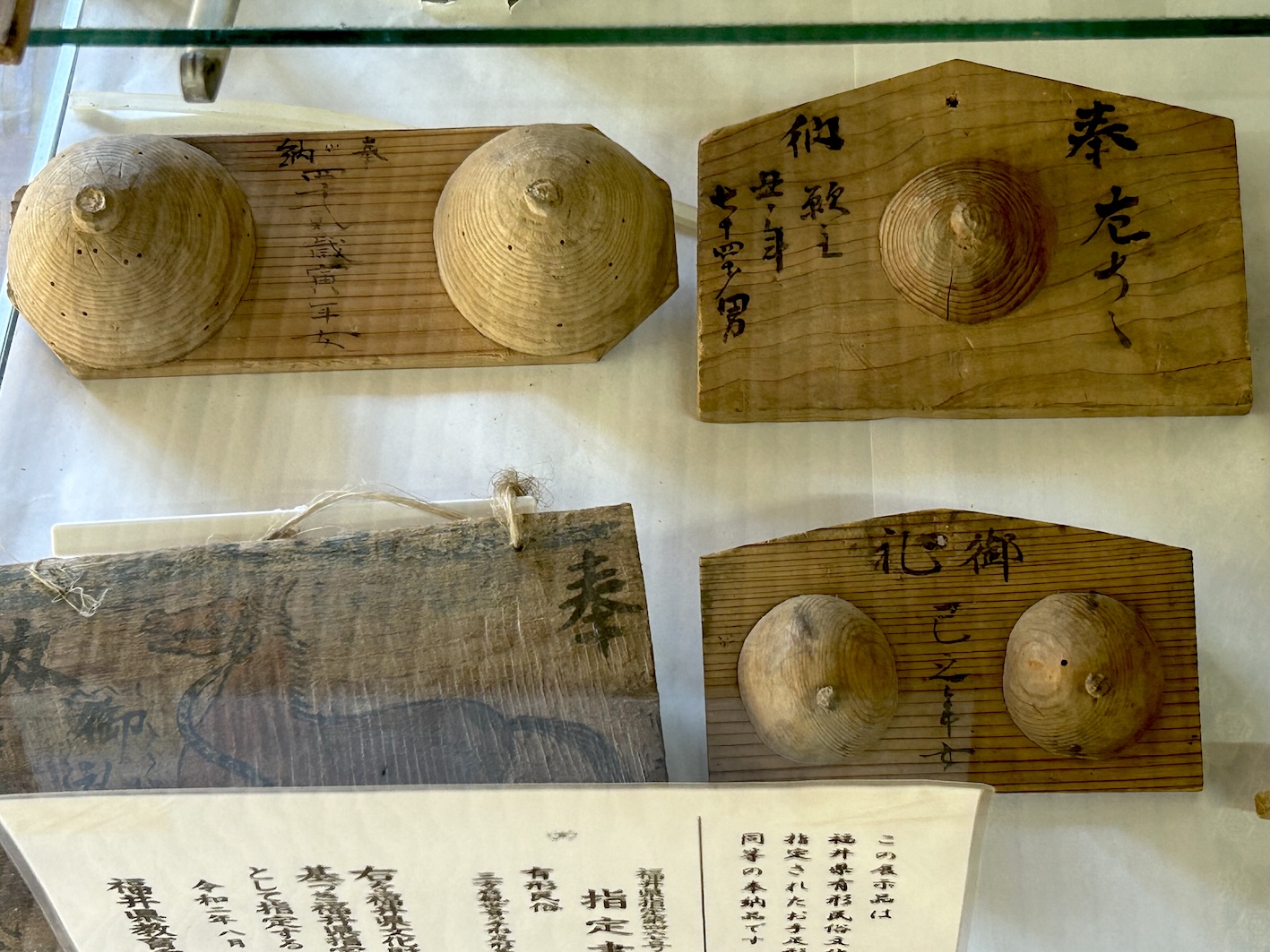 *木製の乳型は布製のものに比べて圧倒的に少なく、他では阿蘇市狩尾の産神社、岡山県真庭市の足王神社、滋賀県大津市和邇中の乳守地蔵堂、千葉県印西市宗甫の馬頭観音堂に見られるのみ。数は三方石観世音が最多である。