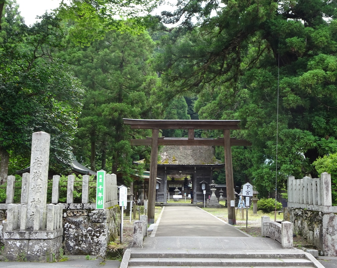 若狭姫神社は養老5年(721)に1.5kmほど離れた場所にある若狭彦神社より分祀した古い神社で、竜宮城の乙姫さまである豊玉姫命(とよたまひめのみこと)を祀る。両方のお宮を合わせて若狭一の宮と呼び、彦神社を上社と呼ぶのに対して姫神社は下社と呼ばれる。彦神社のご祭神は海幸と言われる彦火々出見尊(ひこほほでみのみこと)で、この二柱は鸕鷀草葺不合尊(うがやふきあえずのみこと)の父母である。