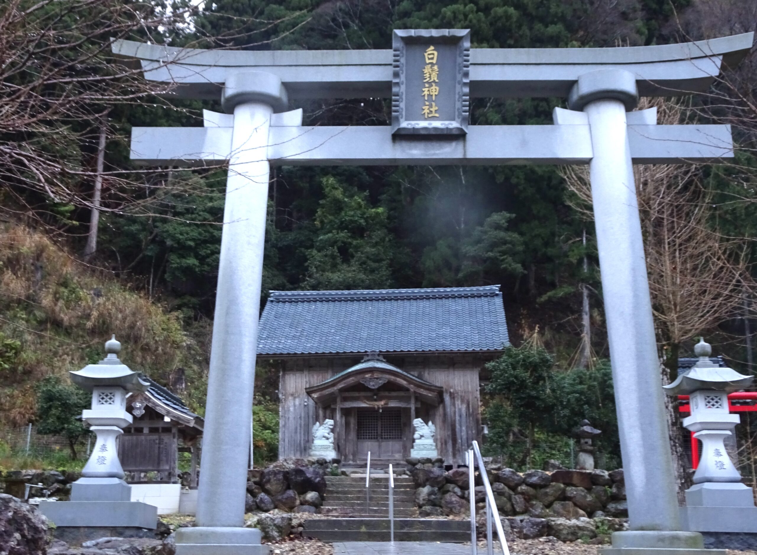 南越前町の山と畠に囲まれた合波集落は「お乳の里合波」と呼ばれ、丘陵と畑地の中に白鬚神社がある。現地の白髭神社略記という説明板の記載によると、武内宿禰が神功皇后の出産後乳が出ないと相談があって祈願したところ、「越の国三尾の里に西面の滝あり、この水をご養婦に奉れば乳の出ること滝の如し」とのご神託があり、この滝を発見。届いた水を飲んだ神功皇后の乳が出るようになり、皇子は健康に育って15代応神天皇になった。その後第22代清寧(せいねい)天皇もご利益に与ったこと、水が「信露滝」の水と呼ばれたことが書かれている。